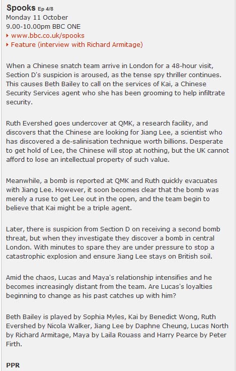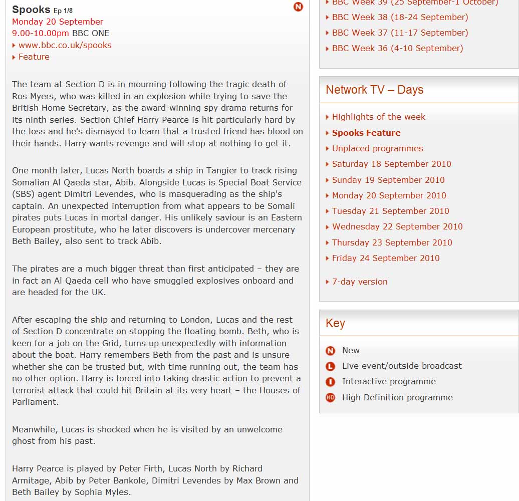 18 Sep 2011 The BBC have several clips from series 8 and 9 on their redesigned Spooks page. The clips only play in the UK.