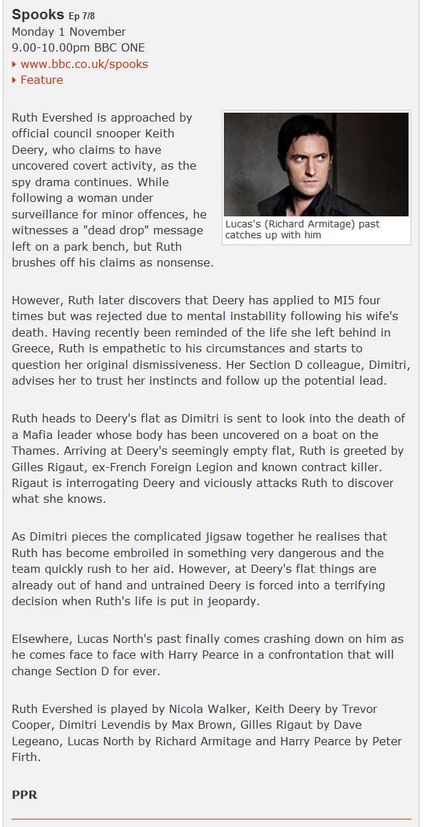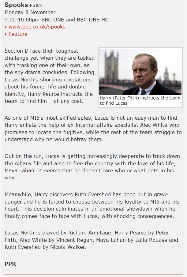 25 Nov 2010 Amazon have a trailer advertising the extras on the Spooks 9 DVD and there’s a few shots of Richard talking to camera and playing Lucas North. You can watch it on the Amazon UK site (click the video thumbnail under the DVD picture).