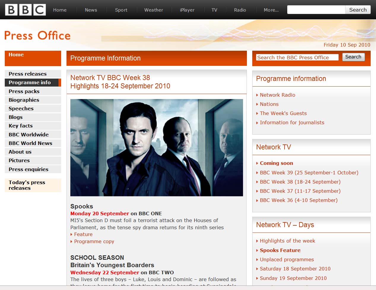 2 Sep 2010 The BBC Press Office has revealed that episode one of Spooks series 9 will be broadcast week beginning 18 September. No exact date and time has been given. There is an interview with Richard (with some spoilers) about what we can expect from Lucas in this series, plus episode one information (spoilers again). Here are all the links: