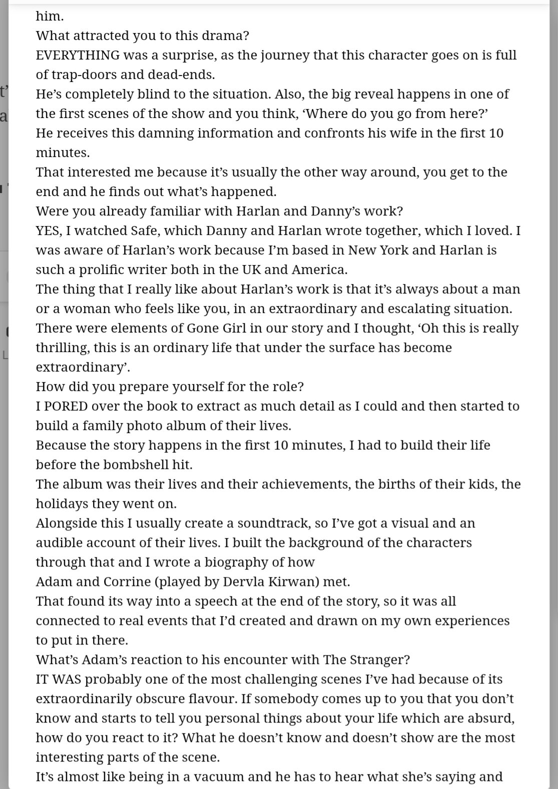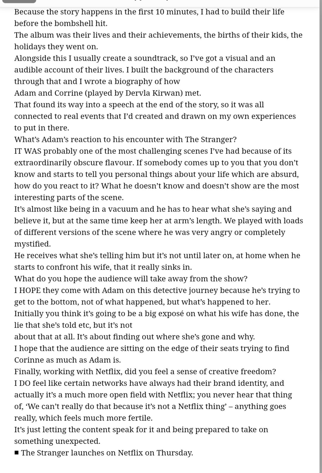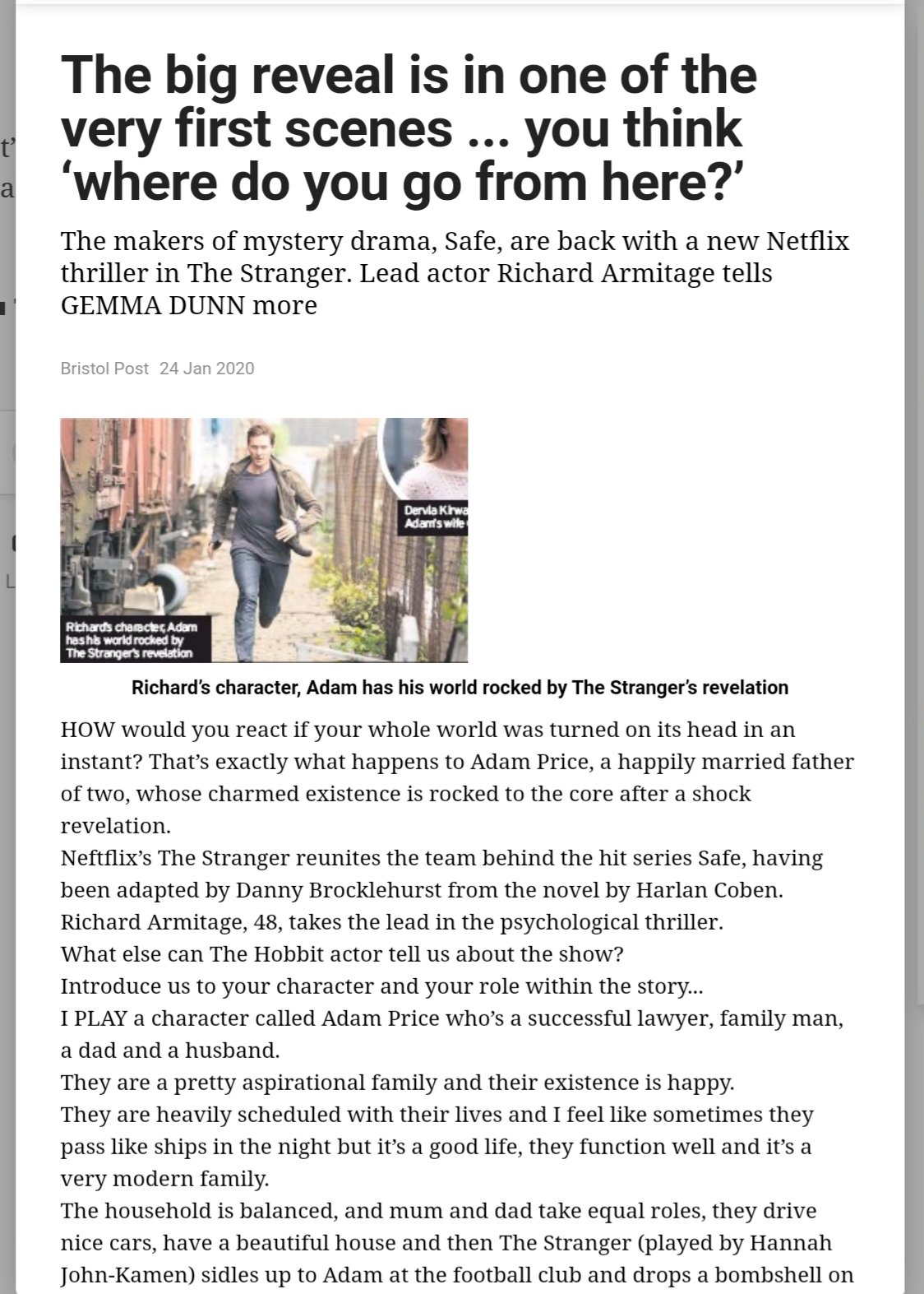 This page contains a list of print and online articles about Richard Armitage in Netflix’s thriller The Stranger, released January 2020. The site will be updated with older interviews as they become available. Click the pictures to enlarge and read.